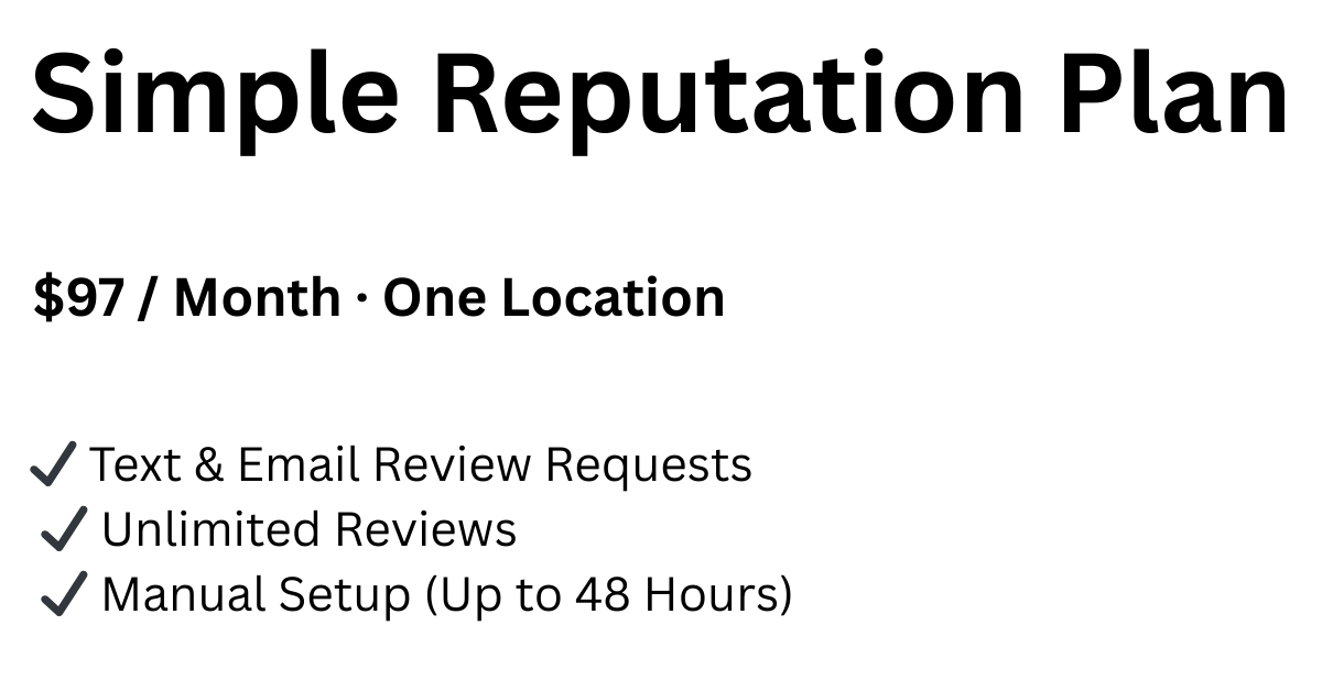 Send review requests by text and email, receive real-time review alerts, and collect unlimited customer reviews through a fully branded portal. Includes manual account setup completed within up to 48 hours. Designed for one business location. Cancel anytime.